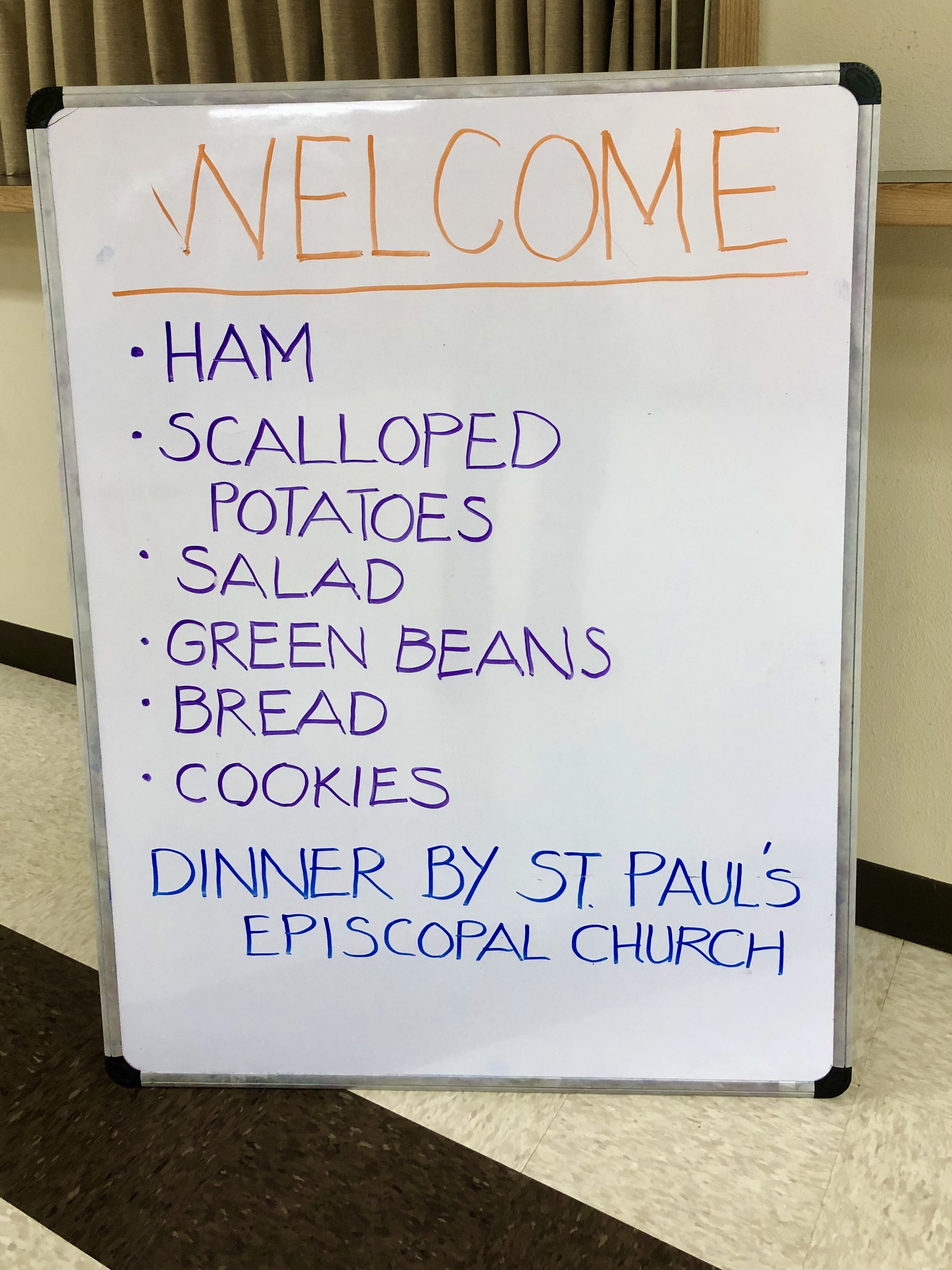 St. Paul’s became involved with Community Meals about four years ago. We serve a free nutritious meal to the community every second Tuesday of the month. We continue to serve meals in a to-go fashion through drive-up service in an effort to keep everyone healthy and safe during the pandemic. The menu varies from pork tenderloin to casseroles, but we always try our best to provide a delicious and balanced meal. Our meals are served in drive-up fashion at 280 Fairgrounds Rd. (Cornerstone Bible Church).