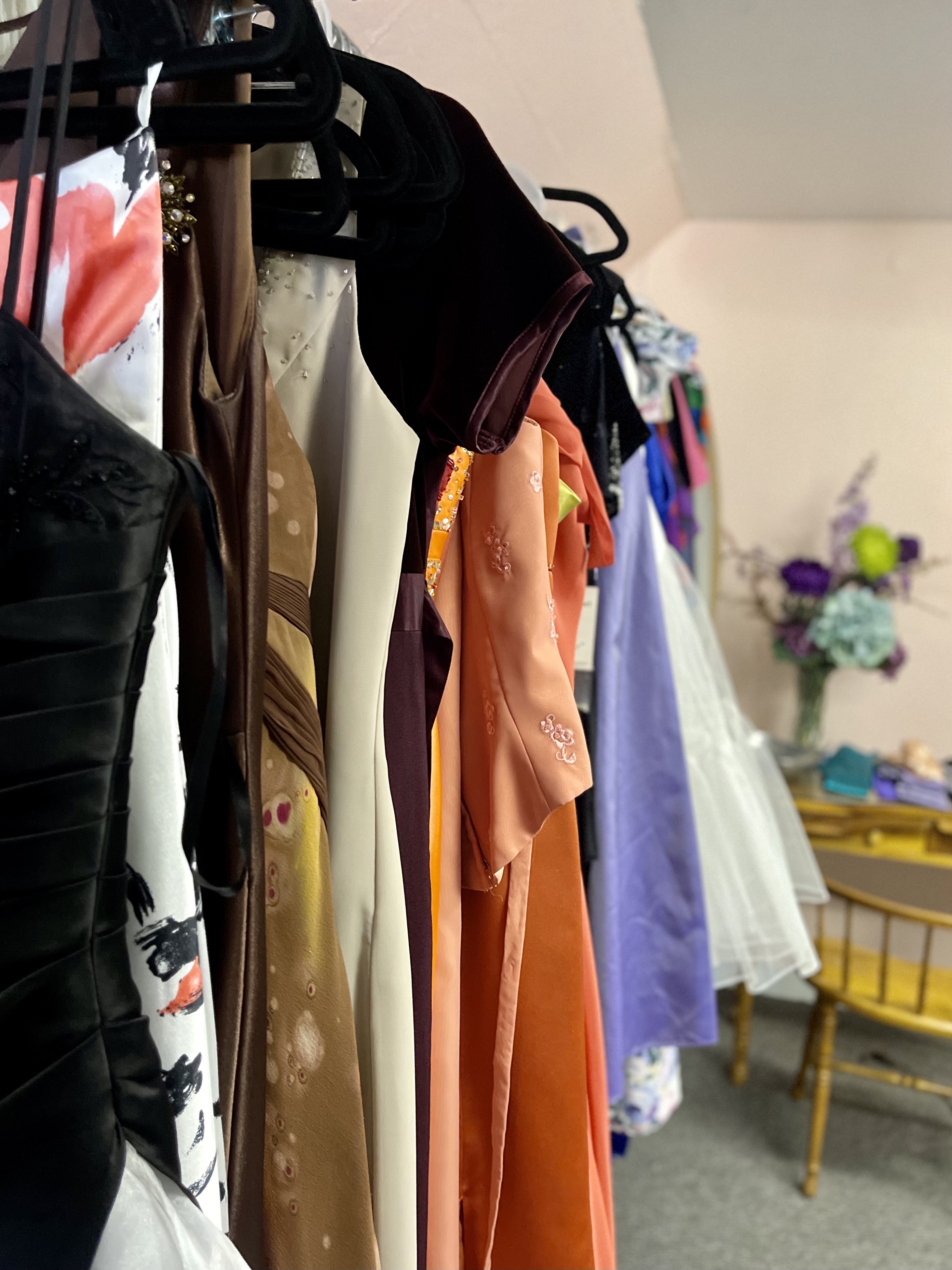 A clothing closet of formal wear with over 200 dresses and gowns, plus tuxedos, shoes, and other accessories.